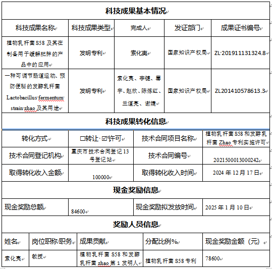 现金奖励公示[2024]2—关于索化夷科研团队科技成果转化奖励的公示