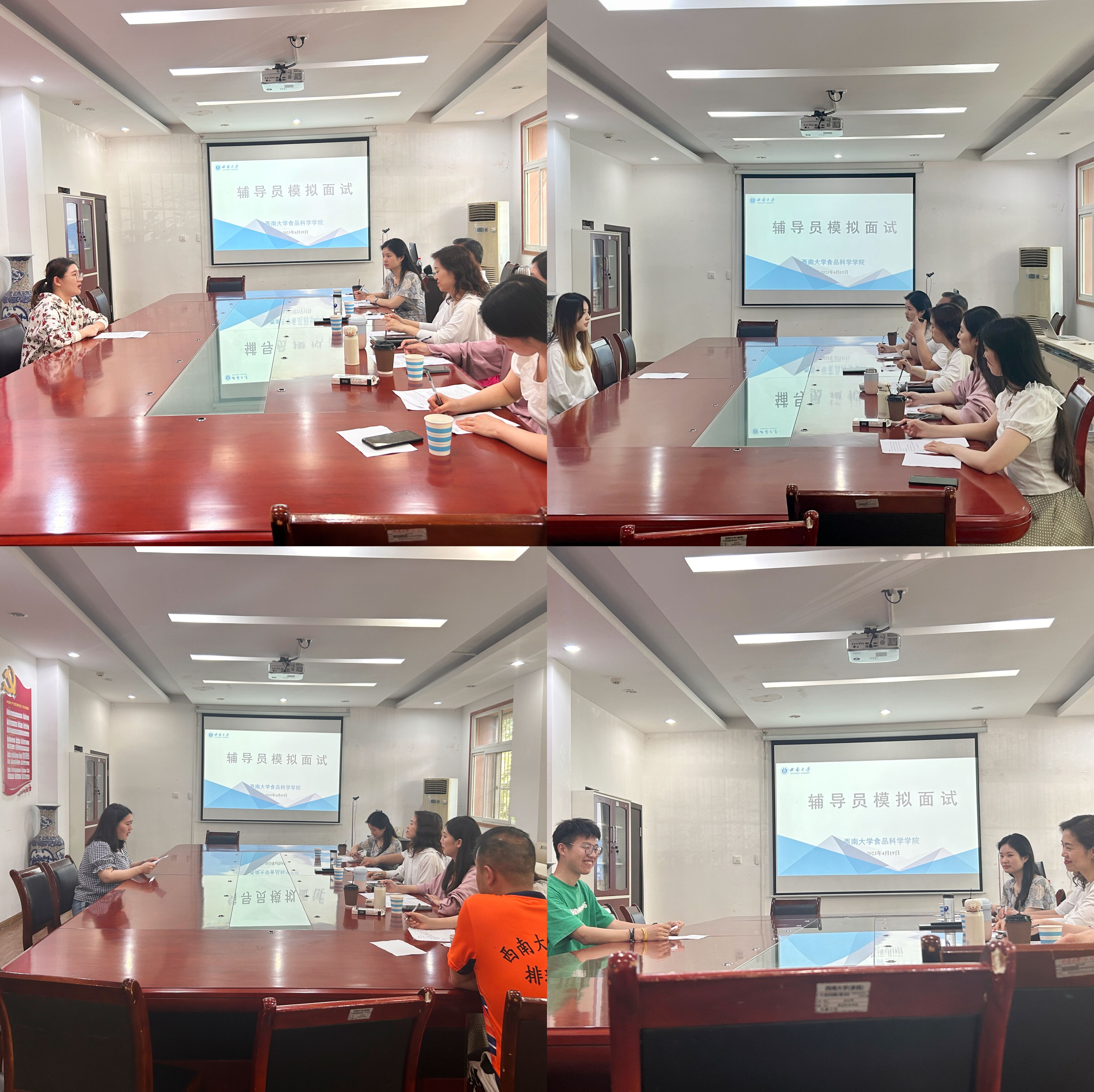 为扎实推进毕业生就业工作,帮助学生实现更加充分更高质量的就业,食品科学学院通过问卷调研和辅导员谈心谈话等形式后,对2023届毕业研究生的高校求职意向进行摸排,深入分析了毕业生的求职需要,于4月19日下午2:30在40教206会议室组织开展了辅导员模拟面试活动。学院党委书记吴俊平、副书记刘秋艳、团委书记黄晔及辅导员张欢、杨希、夏雪受邀担任此次模拟面试主考官。