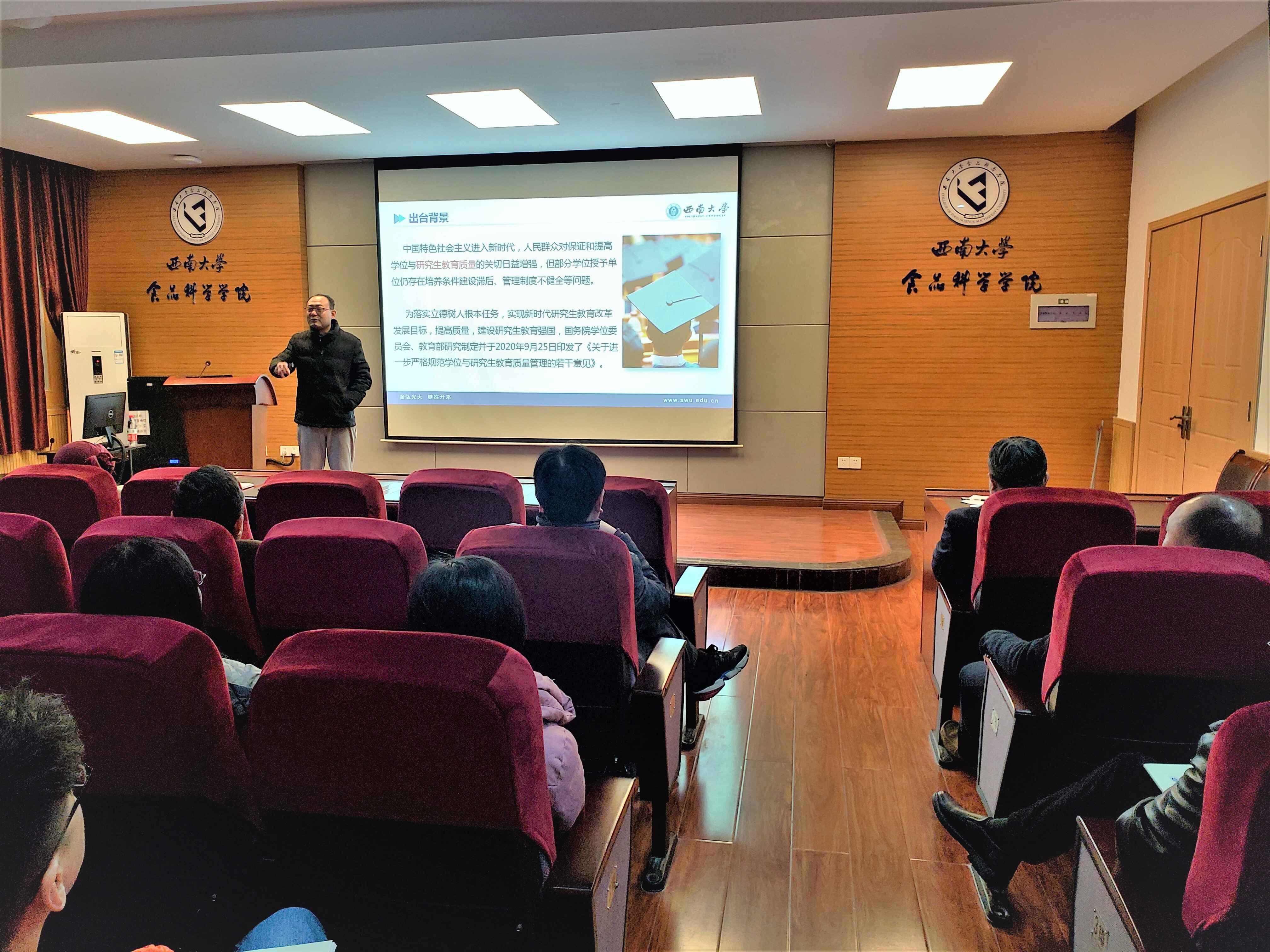 为深入贯彻习近平总书记关于研究生教育工作的重要指示精神,切实提高研究生指导教师队伍水平,强化导师立德树人职责,提高人才培养质量。2020年12月9日,食品科学学院组织全体校内外研究生指导教师开展了专题学习。此次专题学习会由吴俊平书记主持,张宇昊院长主讲,食品科学学院全体校内外研究生指导教师参会。