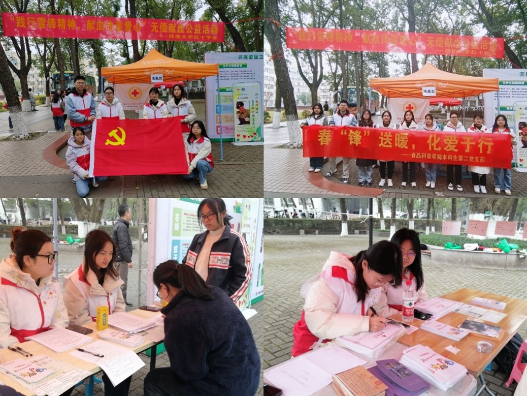 习近平总书记指出“雷锋精神,人人可学;奉献爱心,处处可为。”为弘扬“奉献、友爱、互助、进步”的志愿服务精神,3月10日,本科生第二党支部协助西南大学红十字会开展以“践行雷锋精神,献血传递爱心”为主题的无偿献血活动。经过培训的党员同志在各自岗位上认真工作,热情服务前来献血的同学。魏丽同志表示,作为一名党员同志,能够积极参与到无偿献血这样的公益活动中,把雷锋精神融入到日常的生活和实践中,非常有意义,在实践中,也对雷锋精神有了更加深刻的认识,更加坚定了自己学雷锋的信念。