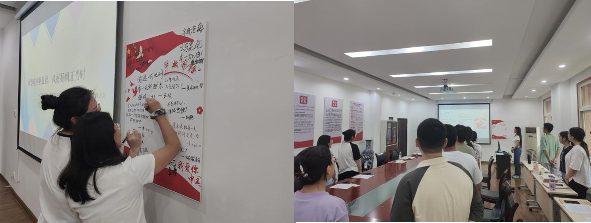党员同志们纷纷在留言板上写下毕业寄语,真诚地表达对大学时光的感慨和对未来的展望,无愧于当下,不妄于未来。全体党员齐唱《我和我的祖国》,用歌声表达对祖国的热爱,激发党员爱国热忱,增强党员对伟大祖国的荣誉感、使命感和责任感。