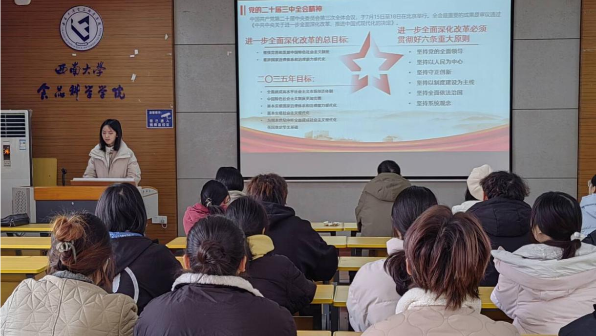 为加强理论武装、增强党性修养,2024年12月27日,本科生第二党支部开展“学习贯彻党的二十届三中全会精神”主题党日活动暨预备党员入党宣誓仪式。学院纪委委员邓丽莉、本科生第二党支部书记方令及支部全体党员同志共同参会。